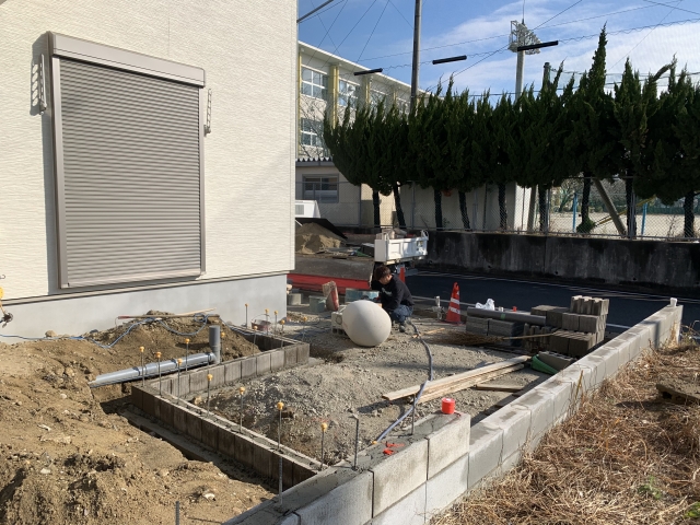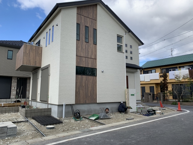 門柱ジョリパット仕上げ 貼材ユニソン クレモナモザイク 色アルモア ポスト三協 SOR-50型 色アーバングレー 表札 美濃クラフトBAS-2 アプローチTOYO工業 アクリナペイブ 300角 色オレンジ 階段 ニッタイギムレー300角タイル3030 照明 タカショーアップライトオプティS