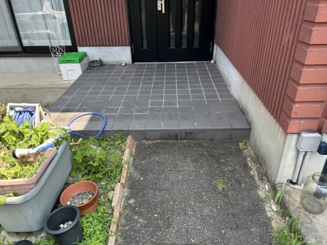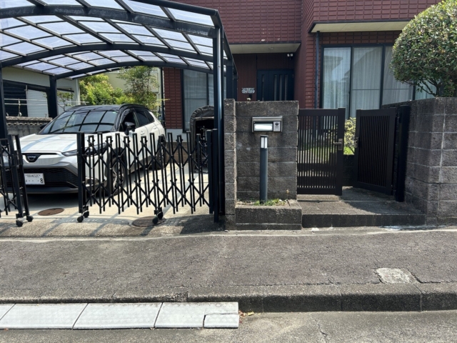 瀬戸市 門リフォーム、車庫拡張 【三協アルミ】3台用カーポート:スカイリード5880(奥行5.8m×間口8.0m)。 機能ポール:ファノーバ2。フェンス:レジリアYK3型 T-8、シャトレナⅡ 1S型 T-6。階段:ミルドブリック、リンクストーンF 773。玄関タイル:アイコットリョーワ カリラ300角